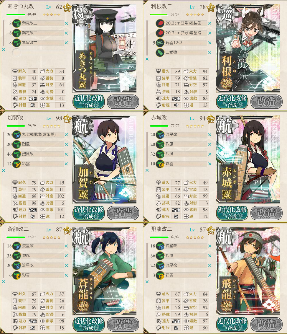 実際、制空値はもう少し少なくても大丈夫だけど、ボーキが夏イベでレア掘りしすぎたため2万台なので、節約するために艦戦を大目に投入してます。