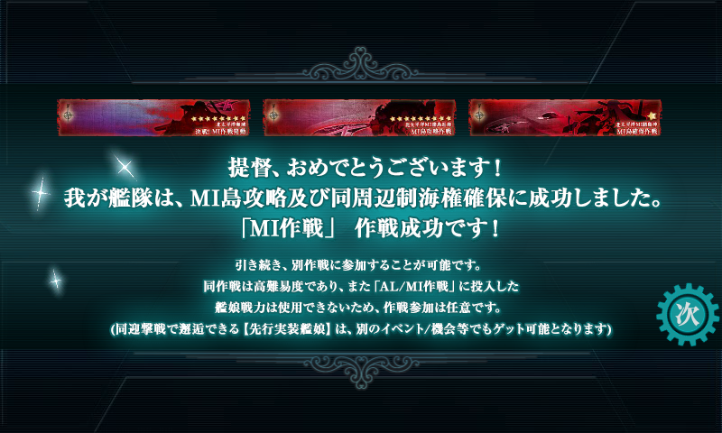 | 4 | 瑞鳳を飛龍に変更。 大淀を改装し、あきつ丸に『艦隊司令部施設』を装備。 BCEの北逸れルート。出鼻を挫かれた・・・。 |