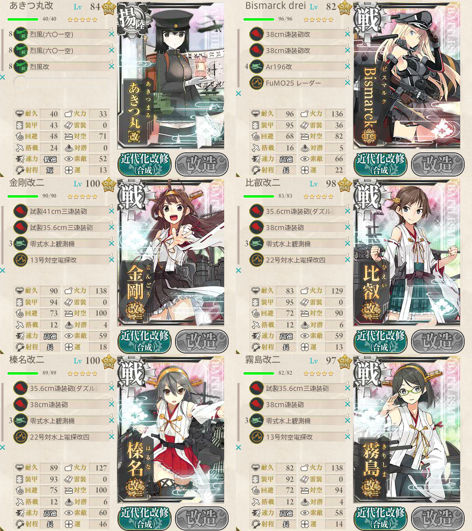 ただし、ボス戦では航空拮抗以下となり、同航戦やT字有利だと開幕の航空戦で大破が数隻出る恐れもある。