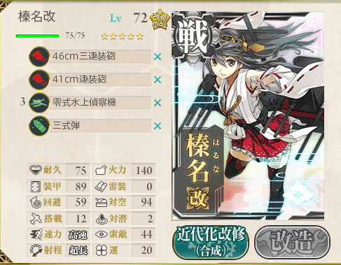 まだ改二が実装されていない榛名に、何とか1つだけ出来た46cm砲を装備。