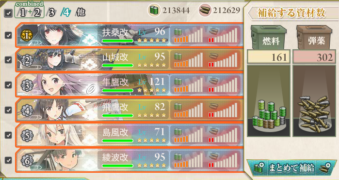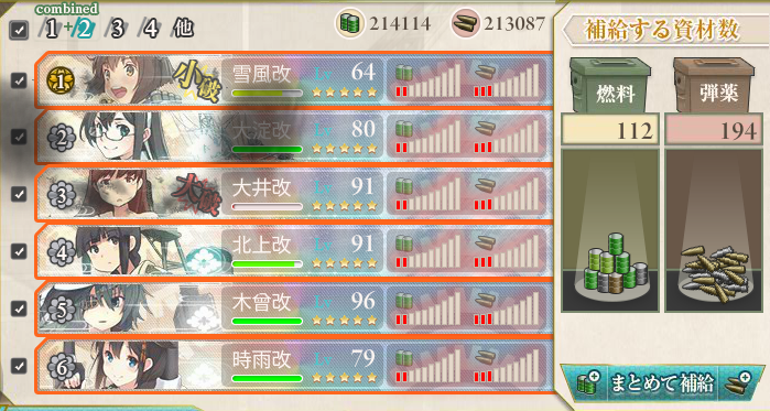 潮ちゃんは、近代化改修がまだMAXではありませんが、次以降の海域での仕様艦もできるだけ改二勢+島風・雪風等でいきたいので、この辺が妥当かも?