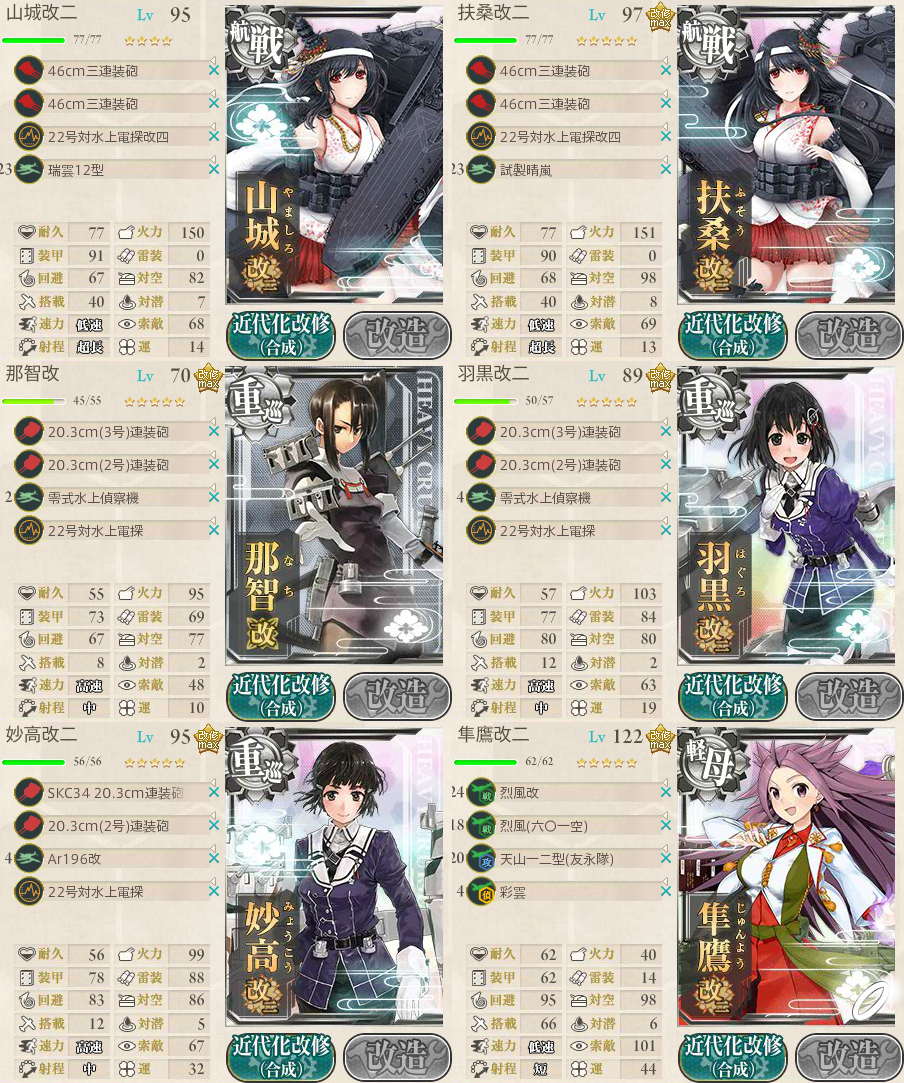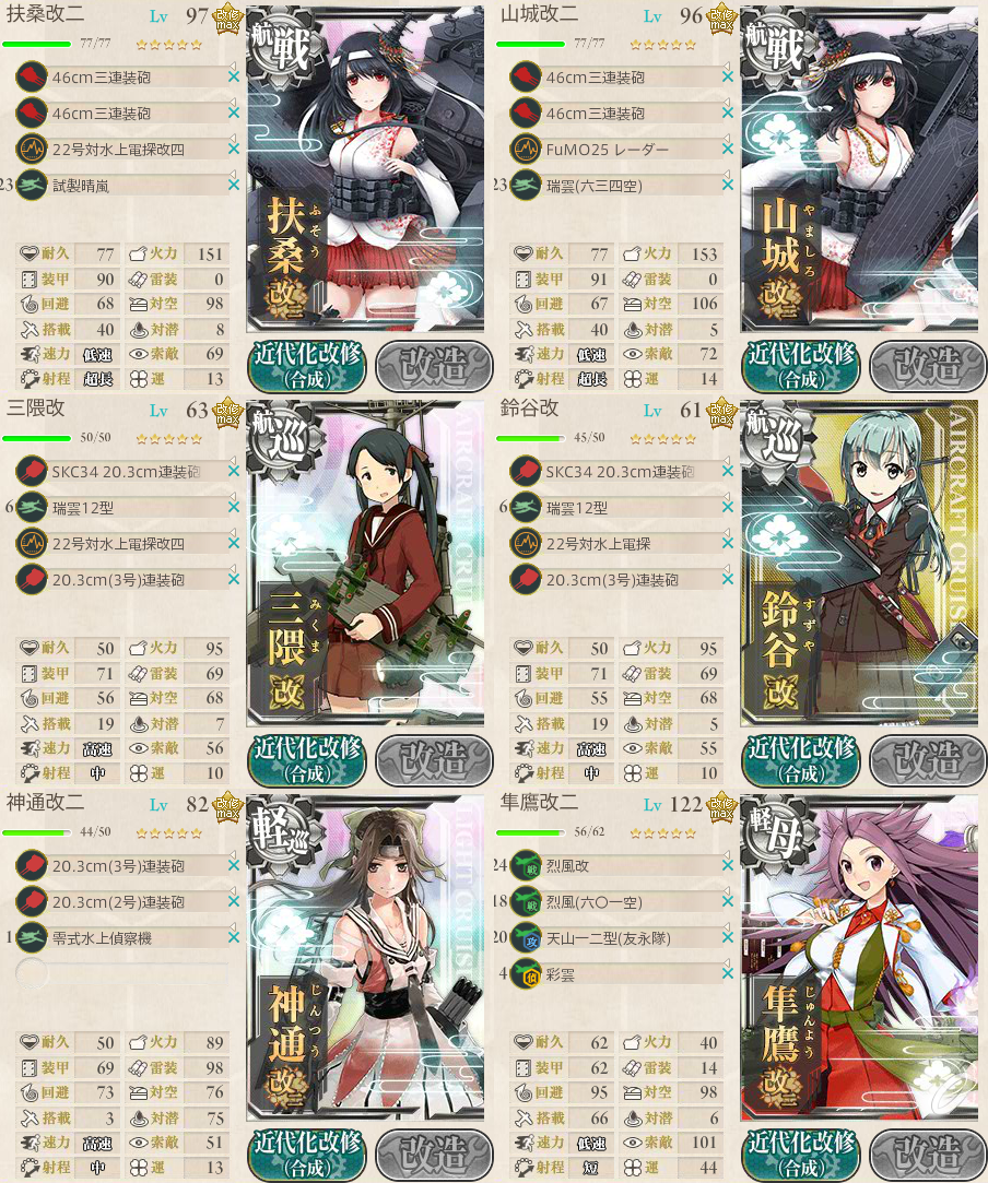 扶桑は、第4スロットの搭載数が正規空母並の23と非常に多く、仕様が変わった航空戦・防空戦でもボスまで20機弱残して行けます。