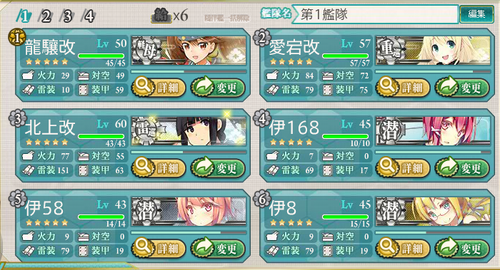 | Aマス | 軽巡ト級/雷巡チ級/雷巡チ級/駆逐ロ級/駆逐イ級/駆逐イ級 | 単縦/梯形 |