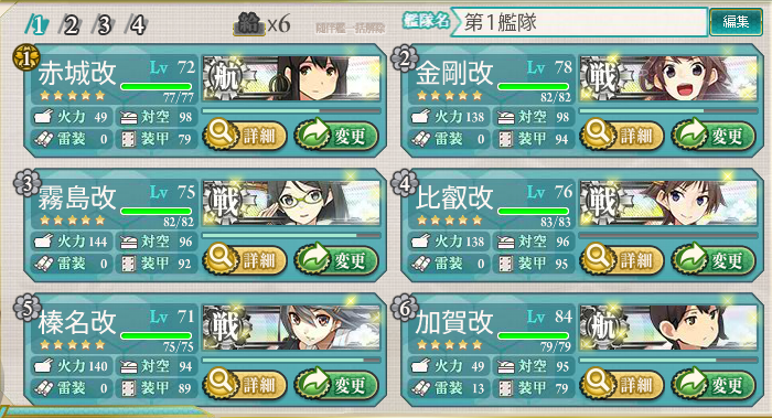 前回の記事から丸4日かけて霧島・比叡・榛名・長門の4隻をレベリングしました。