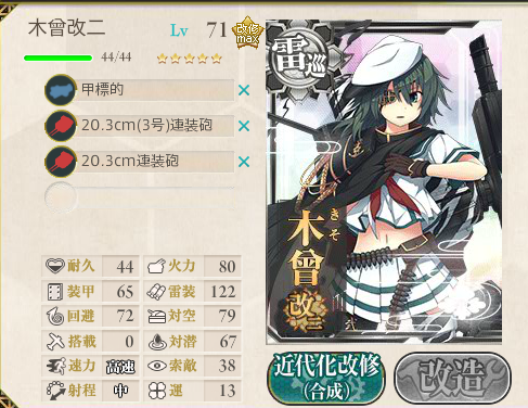 木曾はLv70まで上げる必要があるため、まだ持っていないなら大井・北上の改修(Lv50)がおすすめです。