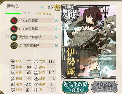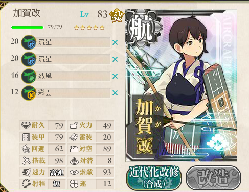 この編成の中では打たれ弱さがあるため、旗艦に1隻配置して戦艦のカバーに期待する形でしょう。