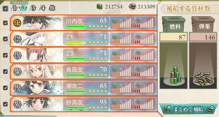 潮ちゃんは、近代化改修がまだMAXではありませんが、次以降の海域での仕様艦もできるだけ改二勢+島風・雪風等でいきたいので、この辺が妥当かも?