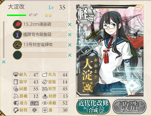 | 13 | 装備を少し変更。(索敵減+制空強化 対夜戦減+命中強化) Aへ進行。 |