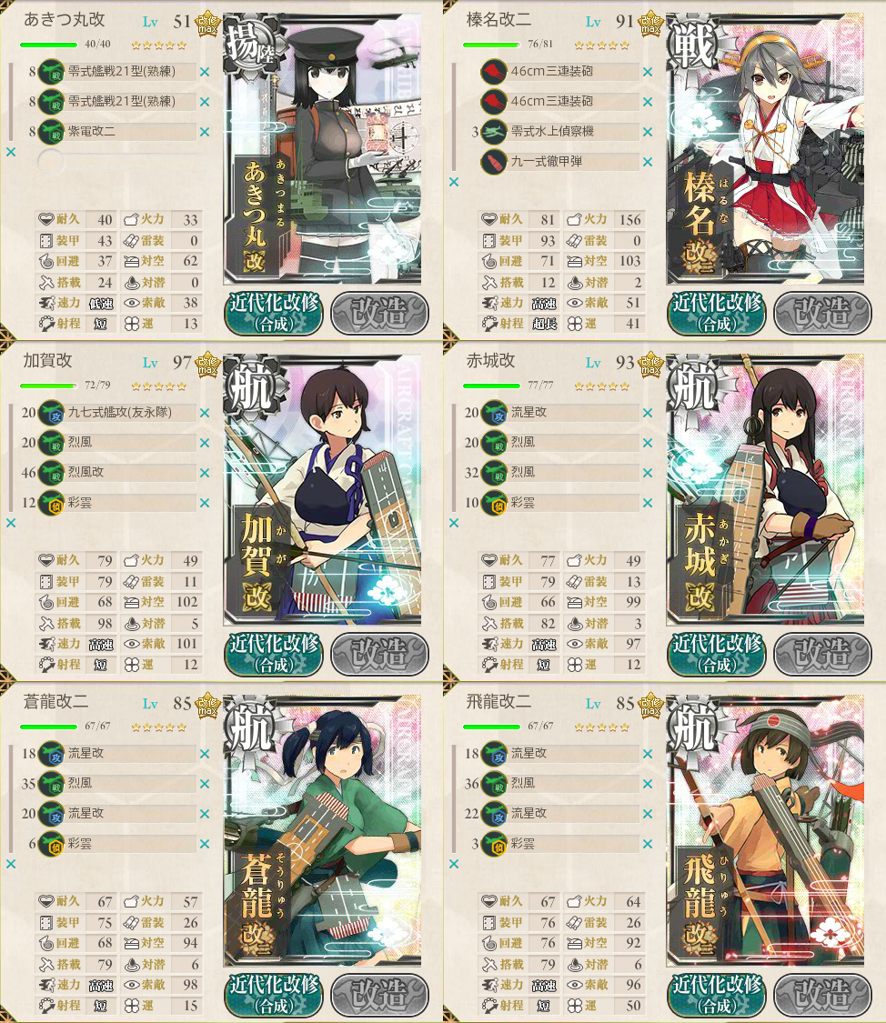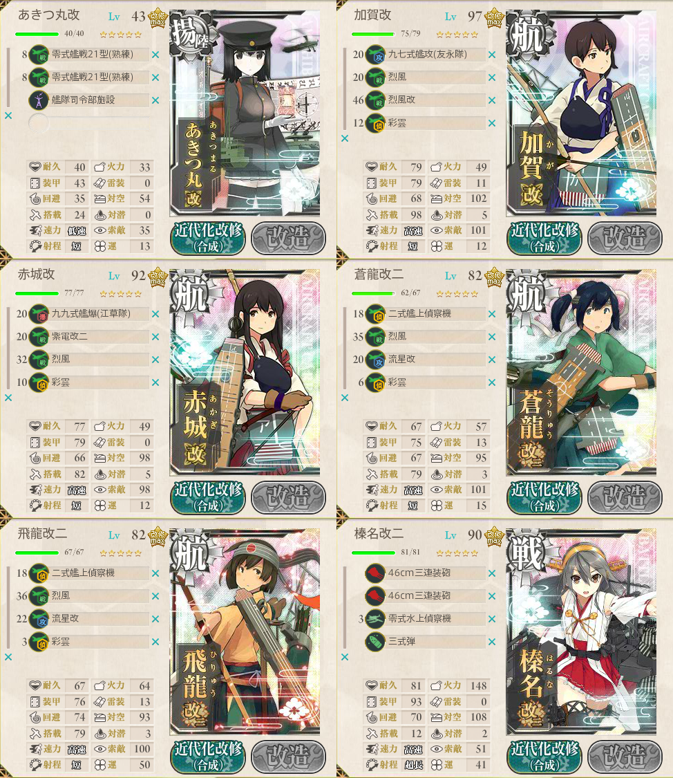 | 4 | 瑞鳳を飛龍に変更。 大淀を改装し、あきつ丸に『艦隊司令部施設』を装備。 BCEの北逸れルート。出鼻を挫かれた・・・。 |