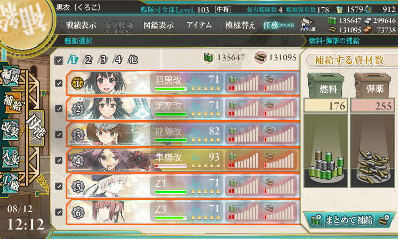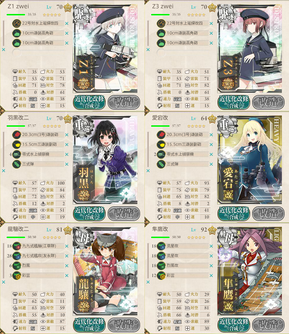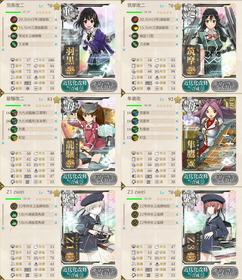 | 6 | Cマスで羽黒、GマスでZ3&隼鷹が中破。 ボロボロの進行だったが、何とか大破なしでボス到達・撃破。 |
