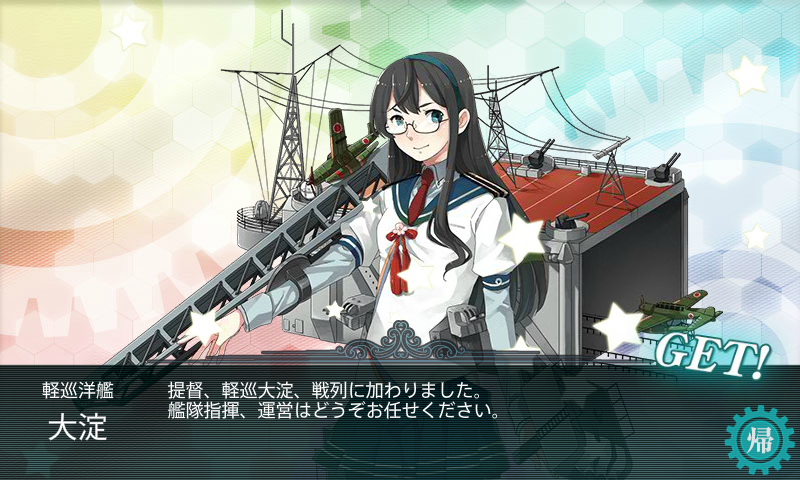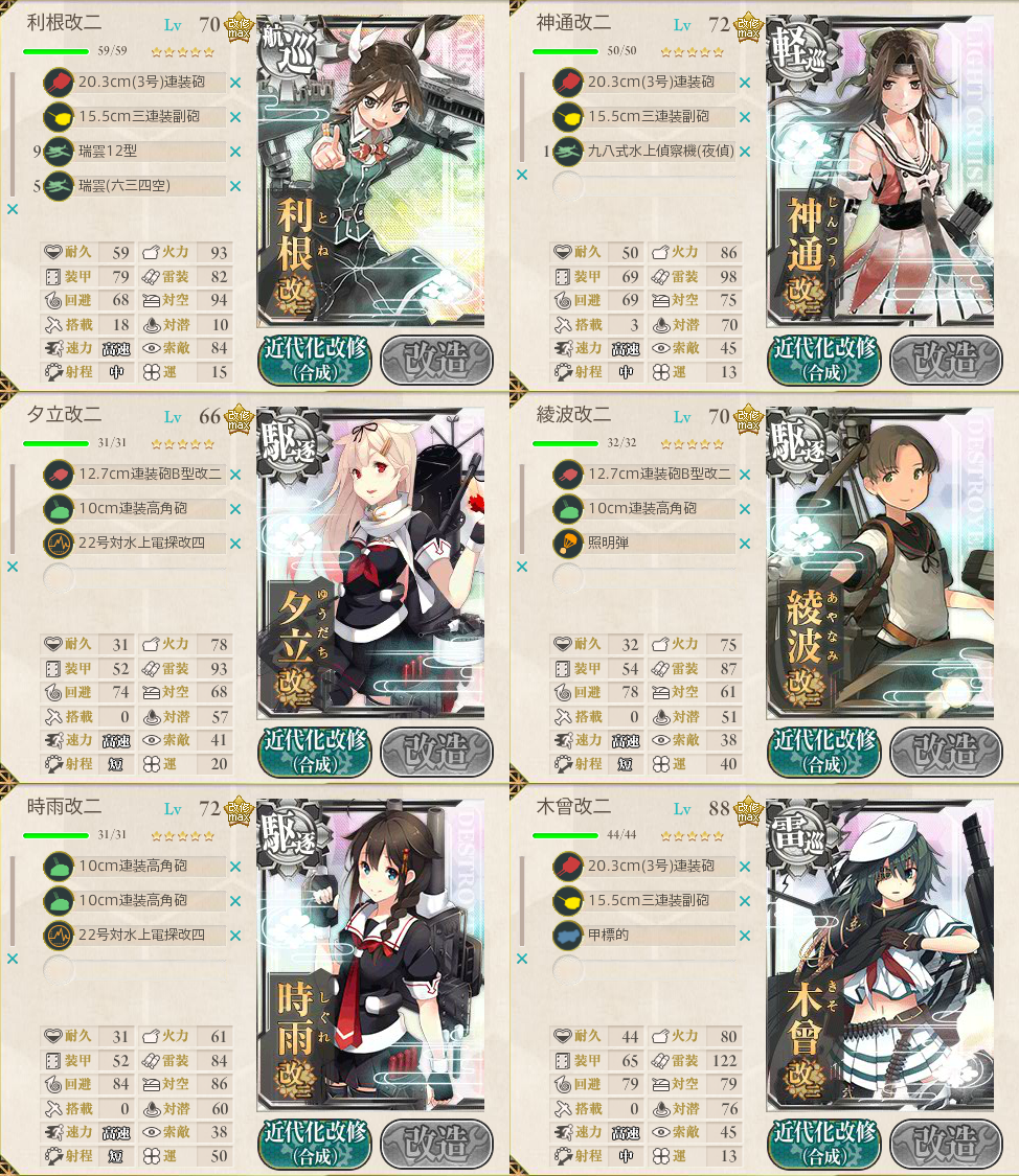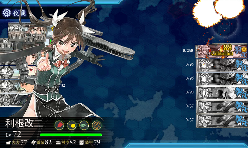 | 12 | DFHの南ルート。 ボス戦で木曾が中破するも、夜戦前に敵は壊滅状態。 夜戦で旗艦の利根がしっかり仕留める。 |