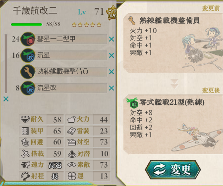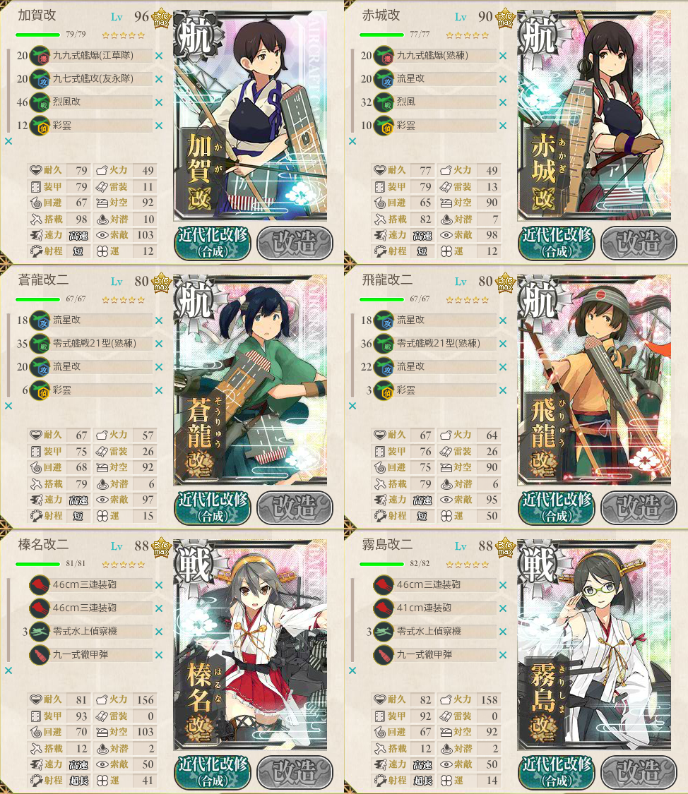| 6 | 三度目の正直で装備変更。二式艦上、彩雲、電探マシマシ。 索敵能力516。 BEHの北ルート。 Bマスでいきなり飛龍が4割ダメージするも、中破なしでボス到達。 |